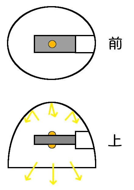 既成品のLEDでよく見るのは、バルブの真上にLEDが鎮座していて、真上方向に光が飛んでいくパターン。